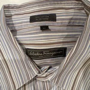 Salavatore Ferragamo Blue/Brown- Striped Button Down Sport Shirt, blue/brown stripes, 100% cotton, vg condition with only the inside materials tag looking worn, ptp 23.5 length 31, sleeve 34