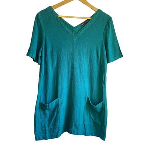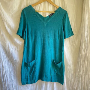 M & S Collection Teal Short Sleeve Tunic Mini Dress, V-Neck, front Pockets, 55%Linen & 45%Viscose blend, size 12.