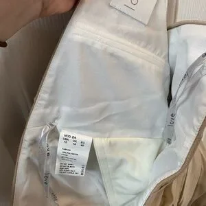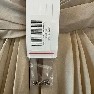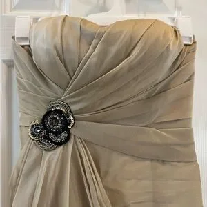 This elegant strapless dress features a beautiful beige color. It is adorned with a stylish brooch detail.