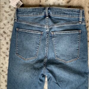 These Abercrombie & Fitch skinny jeans feature a medium to light wash blue denim with stylish fading and whiskering for a vintage appeal. The jeans are designed with distressed areas on the knees, adding an edgy touch to your casual look. The raw hem enhances their laid-back style, making them a versatile addition to your wardrobe. These are super skinny ankle jeans, curve love and hit right above the ankle. Stretchy material but super skinny.