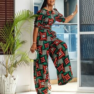 Vibrant with geometric patterns. Features green, red, and black colors. Perfect for a bold statement.