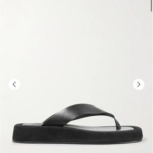 Black leather and Suede flip flops made in italy. The Row's Mary-Kate and Ashley Olsen understand that busy lifestyles call for practical yet stylish shoes, like these 'Ginza' flip flops. They've been made in Italy from smooth leather and suede and have cushioned insoles so you can comfortably wear them all day. Style yours with anything from suiting to dresses. I wore these for about 5 minutes but otherwise are new. Size IT 38.