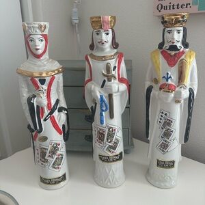 Set of three Ezra Brooks ceramic decanters featuring playing card designs. Includes red, black, gold, and blue accents.