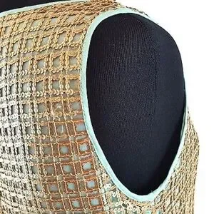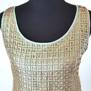 This dress has a 60’s, art deco, Tiffany’s vibe to it. Soft gold metallic micro sequin mesh overlay over a mist blue / green lining. Sheath cut. Mini. Zip closure. In excellent condition.