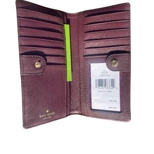 This Kate Spade wallet, in a luxurious purple shade, features a sleek rectangular design and a soft suede-like texture. Its compact size makes it ideal for carrying essentials while maintaining a chic and sophisticated look. The subtle branding adds a touch of elegance to this versatile accessory.