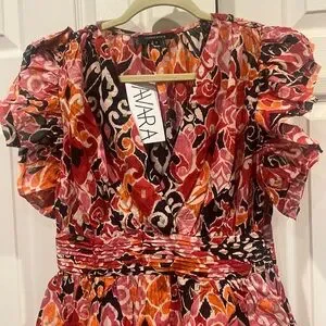 This vibrant floral ruffle dress features a stunning mix of colors, perfect for any occasion. The V-neck design adds a touch of elegance, while the ruffles provide a playful flair. Ideal for adding a pop of color to your wardrobe.