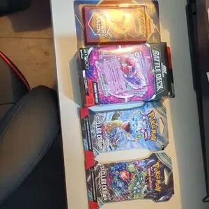 Pokemon trading card game bundle with vibrant packaging. Includes one battle deck, two booster packs, and a mystery booster pack.