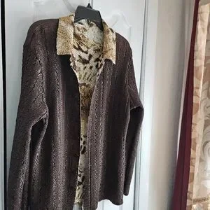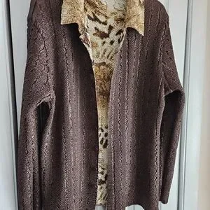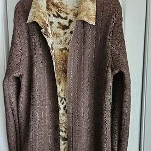 BRAND NEW Stylish brown C Scarf Company button down frout cardigan featuring a unique animal print lining that's reversible. Perfect for adding a touch of wild elegance to your outfit. size XL but will fit up to a XL ... alot of stretch