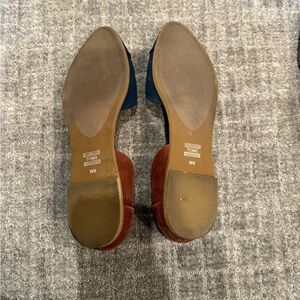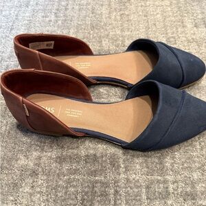 size 9, Toms D’orsay Tan Suede Leather Flat slip-ons, navy and brown, worn maybe once