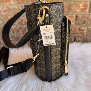 This Michael Kors crossbody bag showcases a sophisticated black and brown color palette, enhanced by an intricate geometric pattern. Its adjustable strap offers versatility, making it a perfect accessory for both casual and formal occasions.