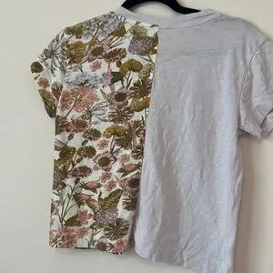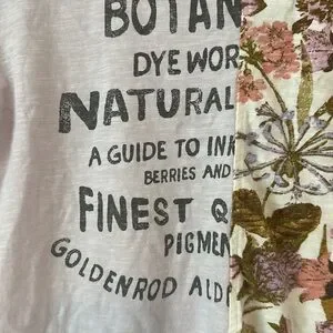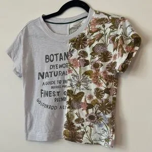 Unique t-shirt with floral and text graphic design. Features a mix of colors including green, brown, and pink/purple