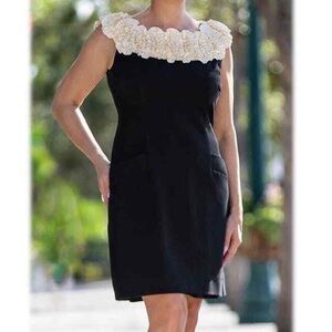 Condition - Excellent - designer black sheath dress - no sign of wear - one of those simple dresses which is a showstopper - with two unopened front pockets - three rows of ivory roses at the neck - carefully tailored - sleeveless - lined - heavy fabric but with movement and stretch - Taylor Dresses are sold at all the major department stores such as Nordstrom, Dillard's, Macy's,