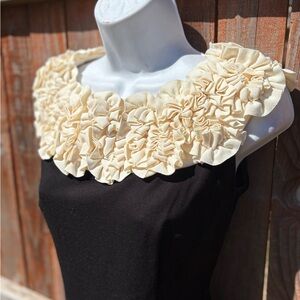This elegant black dress features a stunning cream ruffle detail at the neckline. Perfect for any occasion, it combines classic style with a modern twist