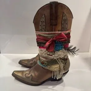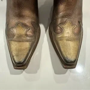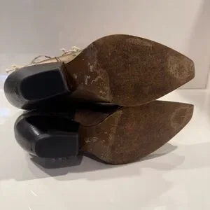 Pre-owned. In good condition. Ware on heels and toes, Threading on boot straps. See pics for details.