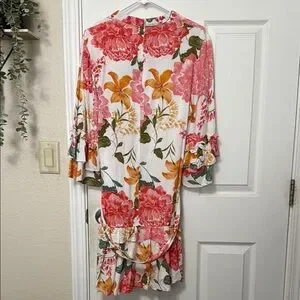 Chic floral dress with ruffle sleeves. Features a vibrant floral pattern and a tie waist.