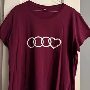 This vibrant red t-shirt features a clever heart graphic design, adding a playful twist to a classic Audi crew neck style. Made from a soft, cotton-like material, it offers a comfortable fit perfect for everyday wear. The short sleeves make it an ideal choice for casual outings. XXL but fits like an XL