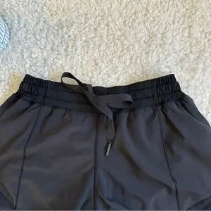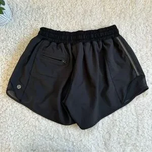 Black Lululemon hotty hot shorts. Drawstring tie. These are the longer version. Perfect for working out or everyday wear. Worn several times so some light signs of wear throughout (closeups pictured) but otherwise still in good condition! Size 4.