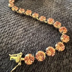 This pretty bracelet features pink shimmering crystals that look lovely in any light. Eight inches from end to end. Add a bit of pop and fun to your wardrobe!