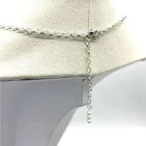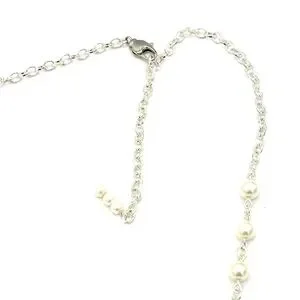 On the sides are linked pearl beads and a silver toned chain at an adjustable length.
