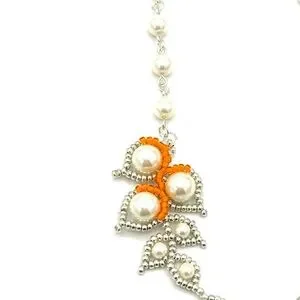 Unique handmade statement necklace with silver and orange seed beads woven into a flower pendant, 3 sizes of white faux pearl beads made into leaf clusters on the sides, with silver seed beads and brilliant orange accents.