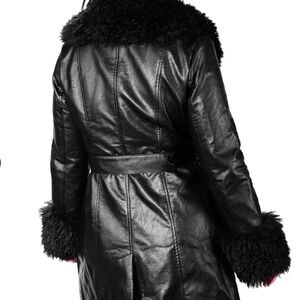 Soft and shiny black vegan leather with the softest black faux fur trim on the collar/lapels and cuffs.