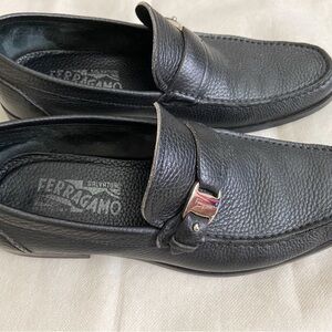 Step up your footwear game with these authentic Salvatore Ferragamo loafers, crafted from premium pebbled leather for a sleek and sophisticated look. These classic slip-on shoes feature a signature metal buckle with the Ferragamo logo, adding a refined touch to their elegant design.