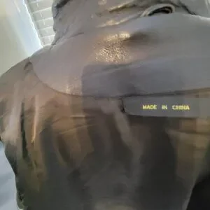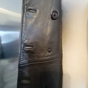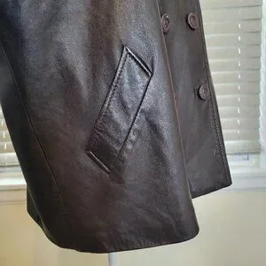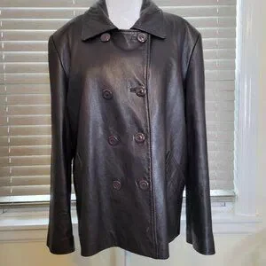 Brown Genuine Leather Sleek Ladies Double Breasted Jacket, Size Large, 8 Buttons, perfect for any occasion. Preowned buttery soft leather in good condition, lining, side pockets, one inside pocket. The collar has a tiny peeling area and scratch on the right front lower side of the jacket, minor fraying on edge of right sleeve that does not affect the beauty of the garment. A good-looking jacket to that's year-round, deep brown. pit to pit measures approximately 24 inches, sleeve length from shoulder is approximately 29 inches, shoulder to front hem measures approximately 27 inches. Professional Dry Cleaning.