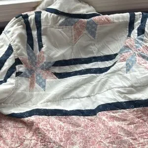 Stylish quilted jacket featuring a faux fur collar. Unique patchwork design with pink and blue accents. Perfect for a cozy, fashionable look.