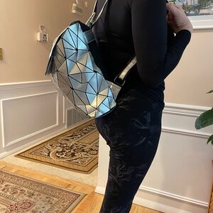 Stylish geometric backpack in a striking silver color. Perfect for adding a modern touch to any outfit.