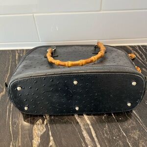 This Dooney & Bourke satchel showcases a sophisticated black and brown color palette, crafted from textured leather with an elegant ostrich skin pattern. The bag's rounded dome shape and distinctive braided handles add a touch of luxury, making it a versatile accessory for any occasion.