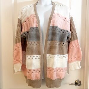 Stay cozy and stylish with this striped open-front cardigan sweater. Featuring a blend of pink, white, gray, and tan colors, this sweater is perfect for layering. Ideal for casual outings or a relaxed day at home.