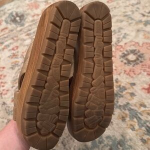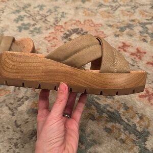 Experience the perfect blend of style and comfort with these tan platform shoes. Featuring soft suede-like crisscross straps and a natural cork sole, these slip-on shoes are ideal for casual outings. Their earthy design ensures a relaxed yet chic look for everyday wear.