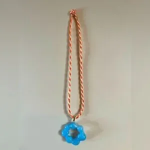 Charming necklace featuring a blue floral pendant on a twisted orange and white cord. Perfect for adding a playful touch to any outfit.