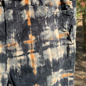 Free People tie-dye printed corduroy skinny jeans. These look so cool layered with longer tops & boots! Cotton & spandex for stretch. Black, orange & tan colorway. Tagged Women’s size W 29 fits like a S/M modeled on a S/M 29” waist 5’5”. These are more of a mid-rise than a high-rise. Slim, skinny leg - more fitted throughout, but with stretch. These are a little tight on me, otherwise I’d keep! Unisex. In good used condition w/no noticeable flaws.