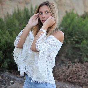 NOT ACCEPTING OFFERS. Jen's Pirate Booty For FREE PEOPLE. Natural Womens Chemical Lace Off The Shoulder Top. Those is a stretchy crochet off-the-shoulder top with elastic neck and waist and bohemian bell sleeves, trimmed in a band of chemical lace. Ivory color, 100% Cotton. New still in its package! #freepeople #jenspiratebooty #chemicallaceup #offshoulder #lace #Crochet