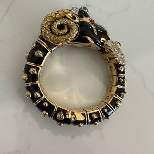 This exquisite jewelry piece features a stunning combination of gold and black, accented with sparkling stones. Perfect for adding a touch of elegance to any outfit. It fits a small wrist and has diamonds m, rubies and an emerald. Weighs 140g of solid 18k with black enamel. It’s stunning!