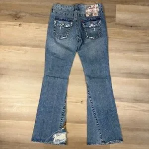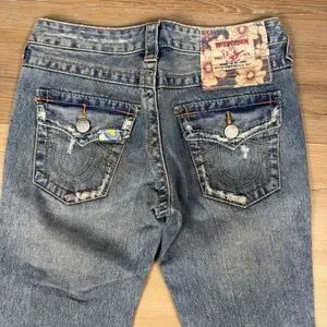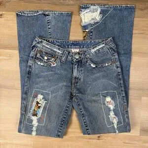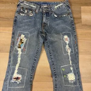 These True Religion jeans feature a classic blue hue with a stylish flare design. The distressed and patchwork detailing adds a vintage touch.