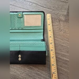 Adorable and roomy Hadley London Scotty large leather black & teal wallet, polka dot interior. Pre-loved condition with a few scuffs and a mark on the inside, still beautiful, with lots of life! Please see all photos.