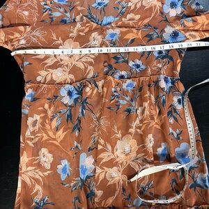 Orangey-coral colored semi-sheer minidress with pops of beautiful blue in the floral pattern.