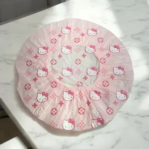 Cute pink shower cap featuring Hello Kitty design. Perfect for keeping hair dry.