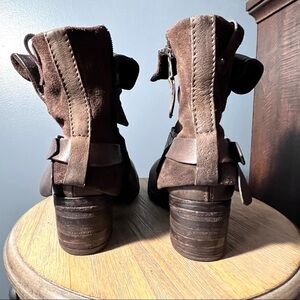 Genuine Suede and Soft Smooth Leather Upper Ankle Boots. Inside Zippers and Leather Straps with Buckle Detail. Heel approx 2”. Size 37 = US Size 6.5-7