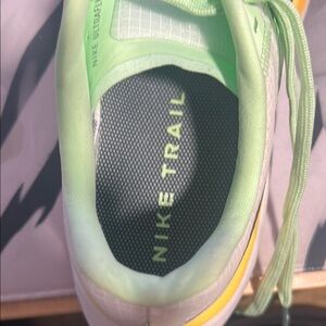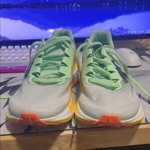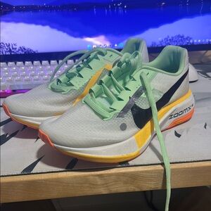 Nike ZoomX running shoes with a vibrant design. Features green, yellow, orange, and black accents.
