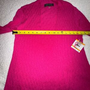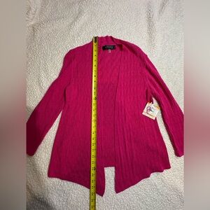 This Kasper cardigan showcases a vibrant pink hue in a lightweight knit, offering an open-front design perfect for layering. Its soft drape and long sleeves make it an ideal choice for mild weather, adding a touch of elegance to any ensemble.