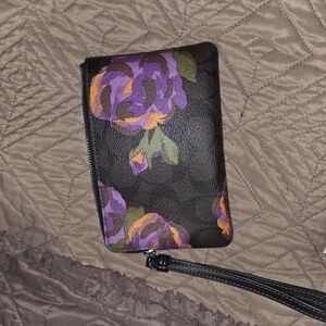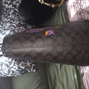 This Coach tote bag features a stylish brown design with vibrant purple floral accents. Perfect for adding a touch of elegance to any outfit.