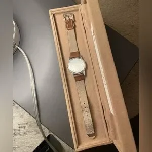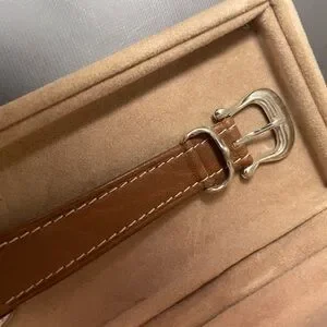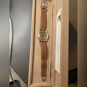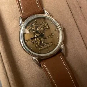 Stylish watch featuring a cowboy design. Brown leather strap with silver accents.