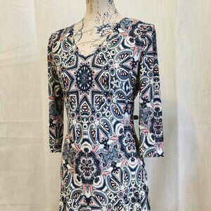 Geometric patterned, lined dress. Has a flattering fit and is machine washable!