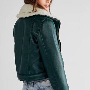 Winter-safari ready. Inspired by the free, audacious spirit of the expedition, our sherpa Crop Moto Jacket reimagines the details and earthly hues that define the uniform of adventurers and paleontologists, alike. Designed through a distinctly Levi's® lens, we've combined novel shapes with soft, comfortable structures in elevated fabrications for the ultimate cozy layer. Its deep forest green tone and oversized sherpa collar mean you'll never sacrifice style for warmth again. And even better — it's sustainably constructed using the most premium Italian leatherette.