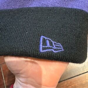 Stylish knit beanie featuring the Baltimore Ravens logo. Perfect for fans. Purple, black, and gray design.