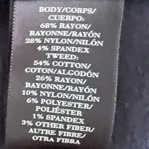 •Material: Body: 68% Rayon/28% Nylon/4% Spandex. Tweed: 54%Cotton/26%Rayon/10% Nylon/6%Polyester/1% Spandex/3%Other