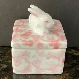 Pink and white box with white rabbit on top with a pink nose, tail, and ears!